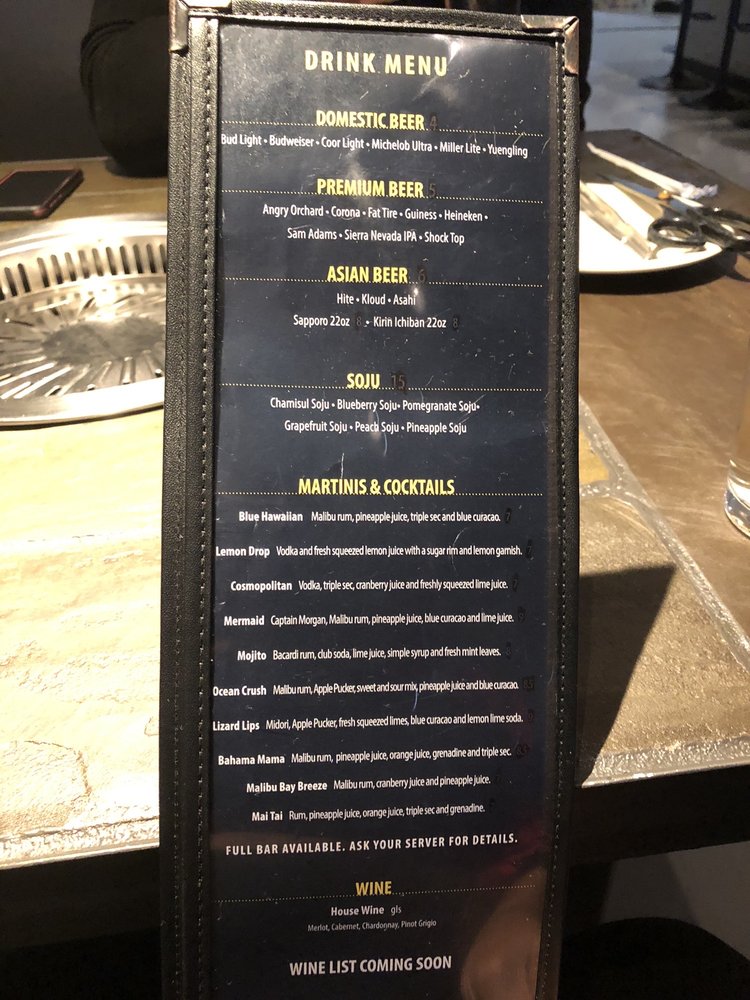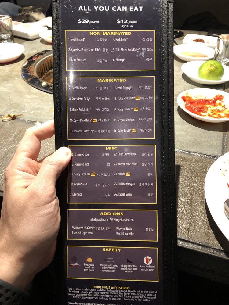 . Beef Brisket . Beef Tongue . Pork Belly . Thin pork belly . Shrimp . Boneless prime short rib . Tenderloin Filet . ribeye steak . pork steak